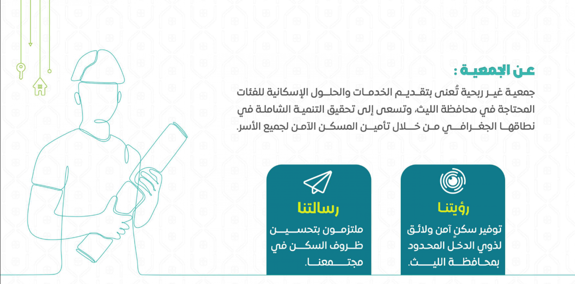 جمعية غير ربحية تعني بتقديم الخدمات والحلول الإسكانية للفئات المحتاجة في محافظة الليث وتسعى إلى تحقيق التنمية الشاملة في نطاقها الجغرافي من خلال تأمين المسكن الآمن لجميع الآسر.